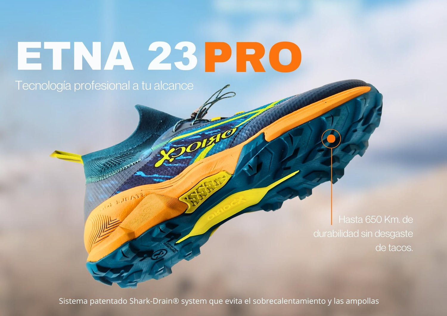 Descubre nuestra nueva zapatilla de trail running Etna 21 Pro. Cuenta con nuestro sistema de drenaje patentado Oriocx Shark-Drain System®.