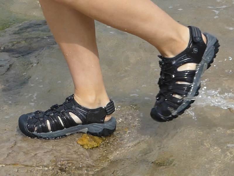 Rutschfeste Gummisohle mit Stollen für gute Wasserableitung.